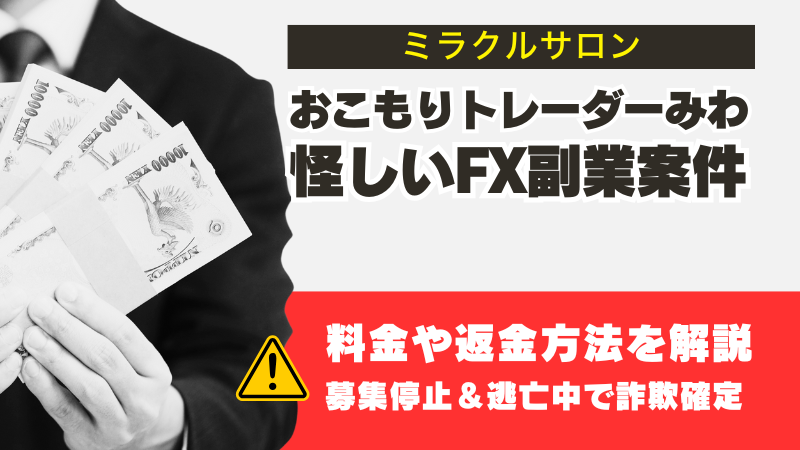 結論から言うと、おこもりトレーダーみわ氏のミラクルサロンは詐欺の可能性が非常に高いです。返金もされないと思われます。