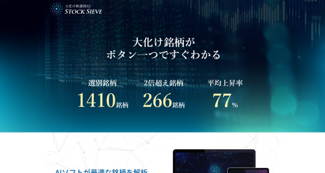 「Stock Sieve(ストックシーブ)」は、AIが膨大に存在するデータを超高速で解析する事で瞬時に上昇率の高い銘柄を選別できるツール。現在は広告ページが削除、提供は終了しています。