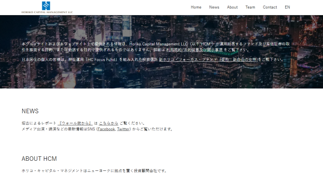 ホリコ・キャピタル・マネジメントはニューヨークに拠点を構える資産運用業者で、堀古英司氏が海外赴任中に銀行を退職し設立した企業です。