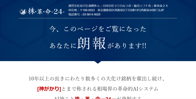 他社の広告ページをパクってる時点で、株革命24がまともなサービスで無い事は明白。相場予想の実績までコピーしてるから、全く稼働してない可能性も考えられます。